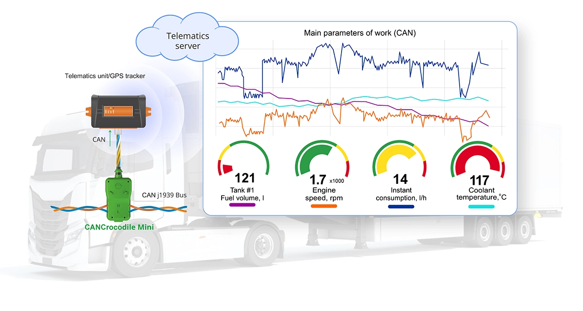 CANCrocodile is designed for safe, contactless data reading from a vehicle’s CAN bus. It is used in vehicle telematics and GPS tracking systems to capture key operational parameters such as speed, RPM, oil pressure and temperature, fuel volume, consumption, and more.