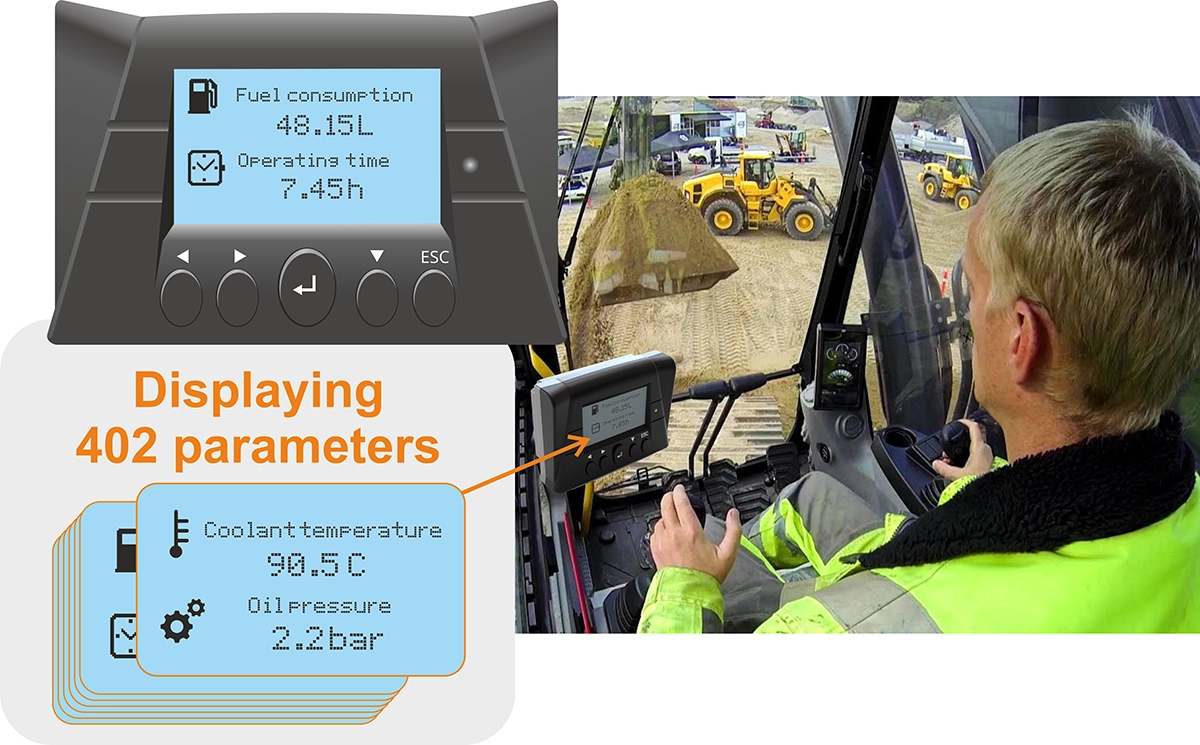 In vehicle telematics, MasterCAN Display functions as a dash-mounted CAN display, allowing drivers and operators to monitor essential engine parameters and receive data from additional sensors and ECUs.